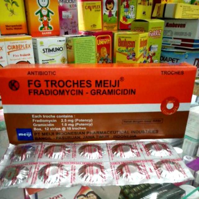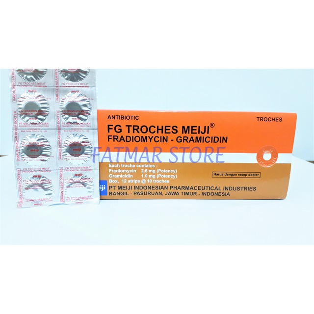 Beli FG TROCHES MEIJI TAB 120S di K24Klik dan dapatkan manfaatnya. Tentunya harga fg troches k24 atau apotik lainnya dengan toko serba ada ini akan berbeda. Fradiomycin sulfate 25 mg gramicidin S-HCL 1 mg.